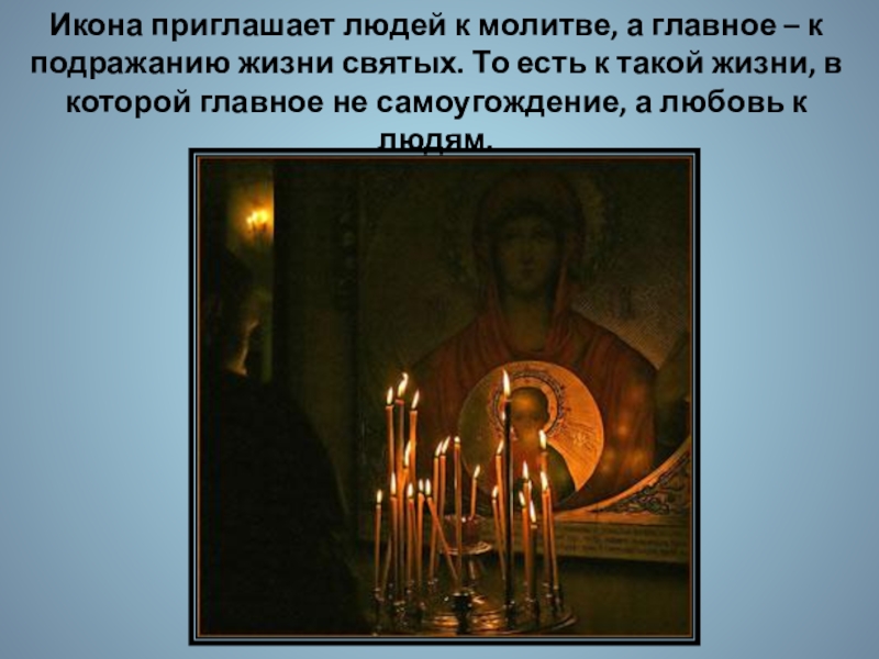Слайд 20Икона приглашает людей к молитве, а главное – к подражанию жизни