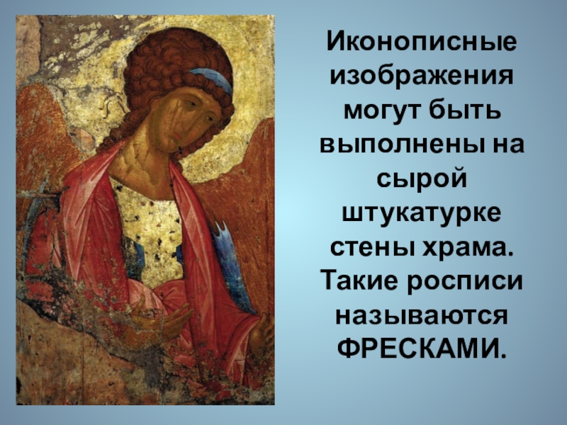 Слайд 4Иконописные изображения могут быть выполнены на сырой штукатурке стены храма. Такие
