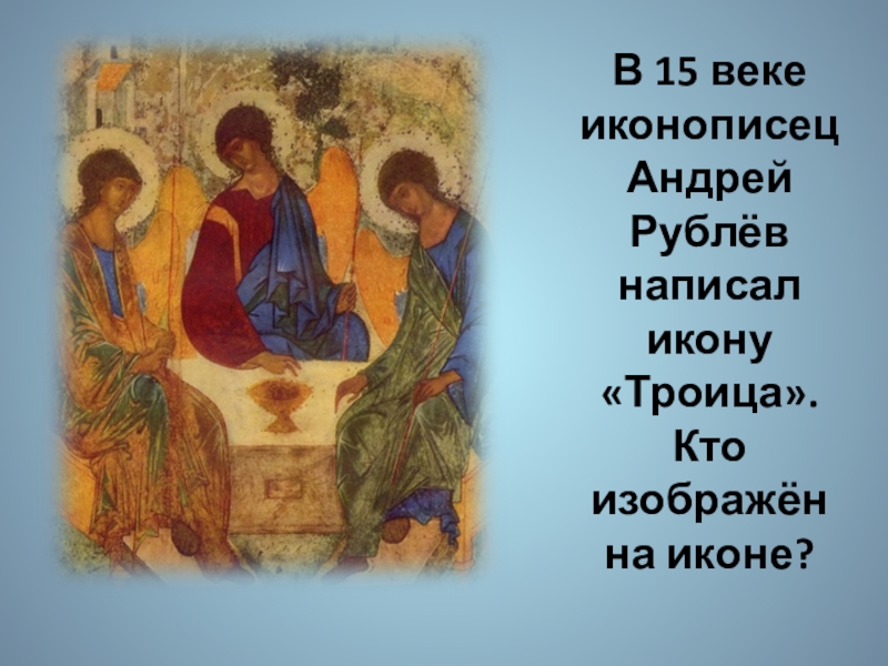 Слайд 8В 15 веке иконописец Андрей Рублёв написал икону «Троица». Кто изображён