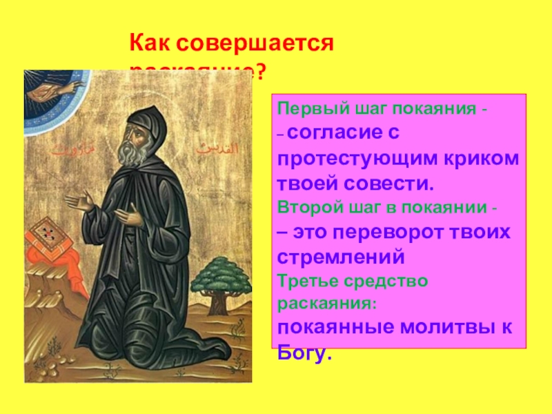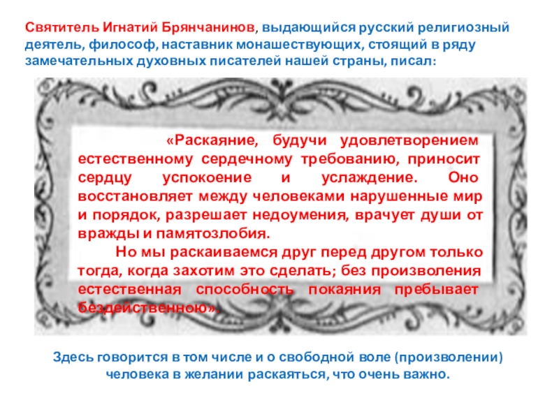 «Раскаяние, будучи удовлетворением естественному сердечному требованию, приносит сердцу успокоение и услаждение. Оно восстановляет между человеками нарушенные мир и порядок, разрешает недоумения, врачует души от вражды и памятозлобия.