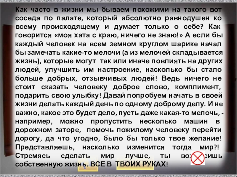 по палате, который абсолютно равнодушен ко всему происходящему и думает только о себе? Как говорится «моя хата с краю, ничего не знаю!» А если бы каждый человек на всем земном круглом шарике начал бы замечать какие-то мелочи (а из мелочей складывается жизнь), которые могут так или иначе повлиять на других людей, улучшить им настроение, насколько бы стало больше добрых, отзывчивых людей! Ведь ничего не стоит сказать человеку доброе слово, комплимент, подарить свою улыбку! Давай попробуем начать в своей жизни делать каждый день по одному доброму делу. И не важно, какое это будет дело, пусть даже какая-то мелочь, - например, можно пропустить несколько машин в дорожном заторе, помочь пожилому человеку перейти дорогу, да что угодно, было бы только твое желание! Представляешь, насколько изменится тогда мир?! Стремясь сделать мир лучше, ты возвысишь собственную жизнь. ВСЕ В ТВОИХ РУКАХ!