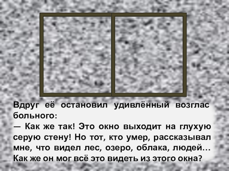 выходит на глухую серую стену! Но тот, кто умер, рассказывал мне, что видел лес, озеро, облака, людей… Как же он мог всё это видеть из этого окна?
