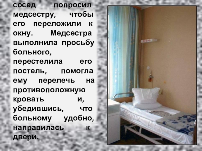 Слайд 10Когда его унесли, сосед попросил медсестру, чтобы его переложили к окну.