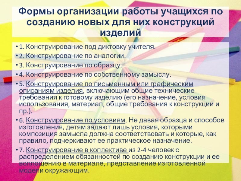 7. Конструирование в коллективе из 2-4 человек с распределением обязанностей по созданию конструкции и ее воплощению в материале, представление изготовленной модели окружающим.