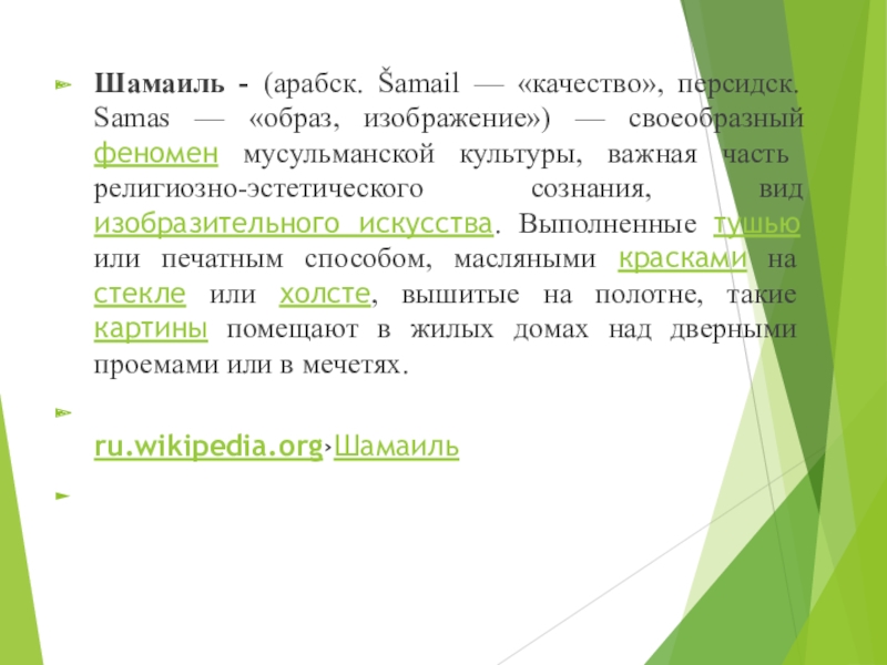 Слайд 32Шамаиль - (арабск. Šamail — «качество», персидск. Samas — «образ, изображение»)