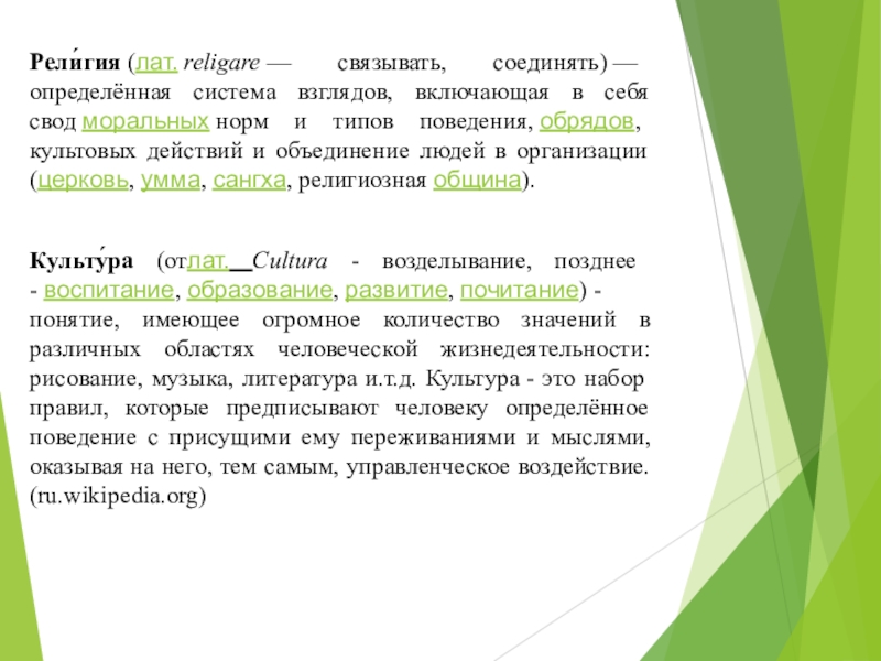 Слайд 14Рели́гия (лат. religare — связывать, соединять) — определённая система взглядов, включающая в себя свод моральных норм и