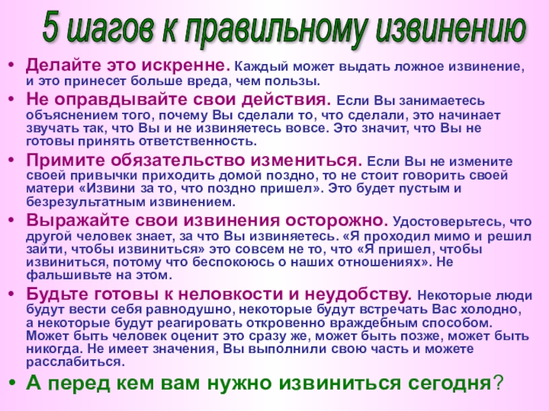 Не оправдывайте свои действия. Если Вы занимаетесь объяснением того, почему Вы сделали то, что сделали, это начинает звучать так, что Вы и не извиняетесь вовсе. Это значит, что Вы не готовы принять ответственность.