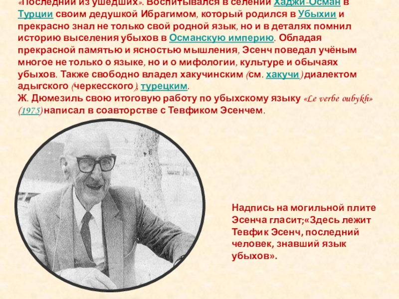 Надпись на могильной плите Эсенча гласит;«Здесь лежит Тевфик Эсенч, последний человек, знавший язык убыхов».