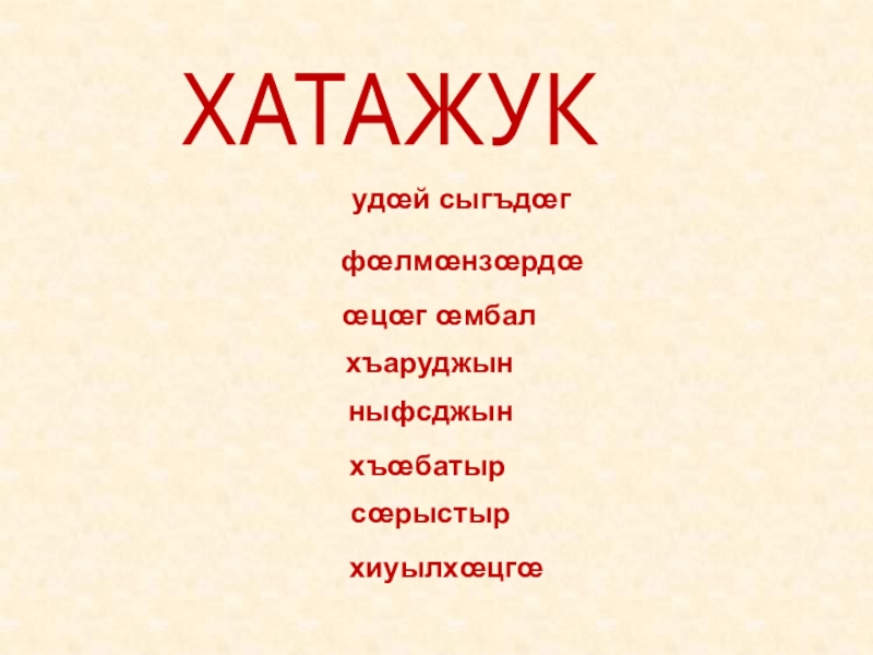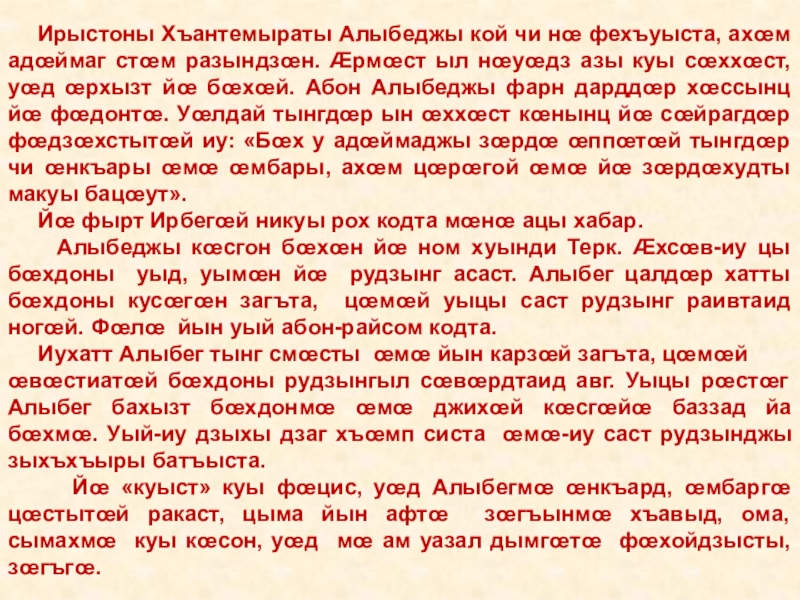 (Цæлыккаты А. радзырд «Фæстаг уыбыхаг»-мæ гæсгæ)