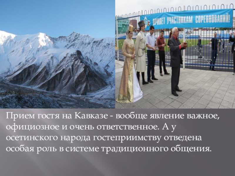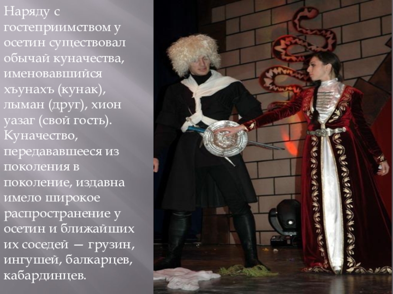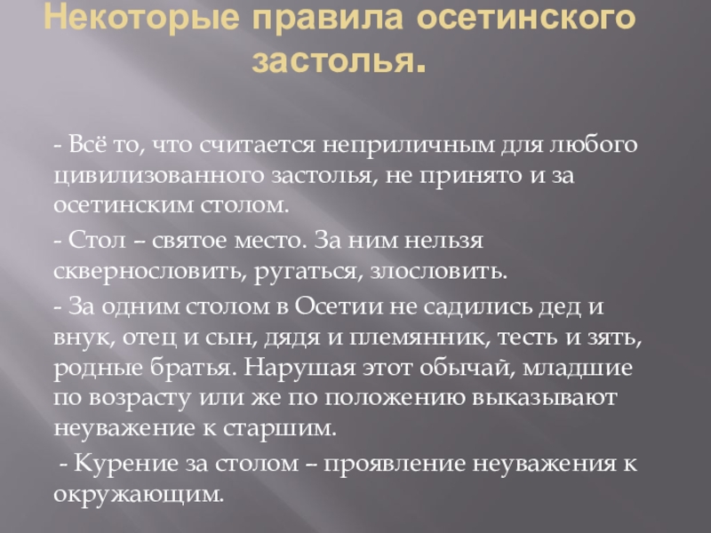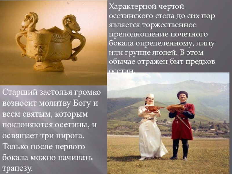 Характерной чертой осетинского стола до сих пор является торжественное преподношение почетного бокала определенному, лицу или группе людей. В этом обычае отражен быт предков осетин.