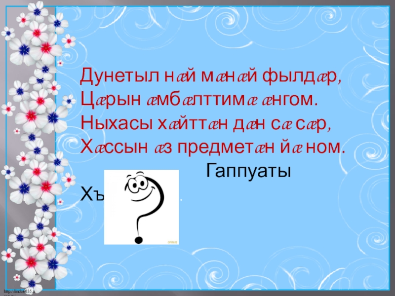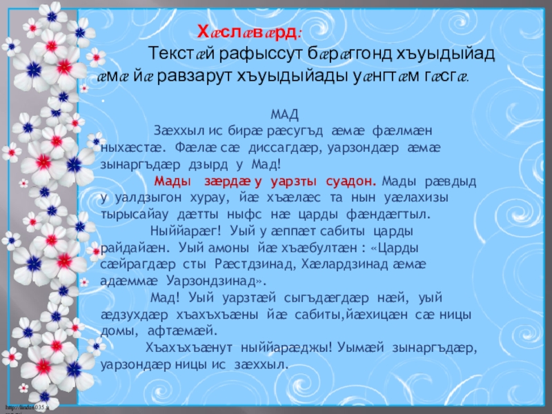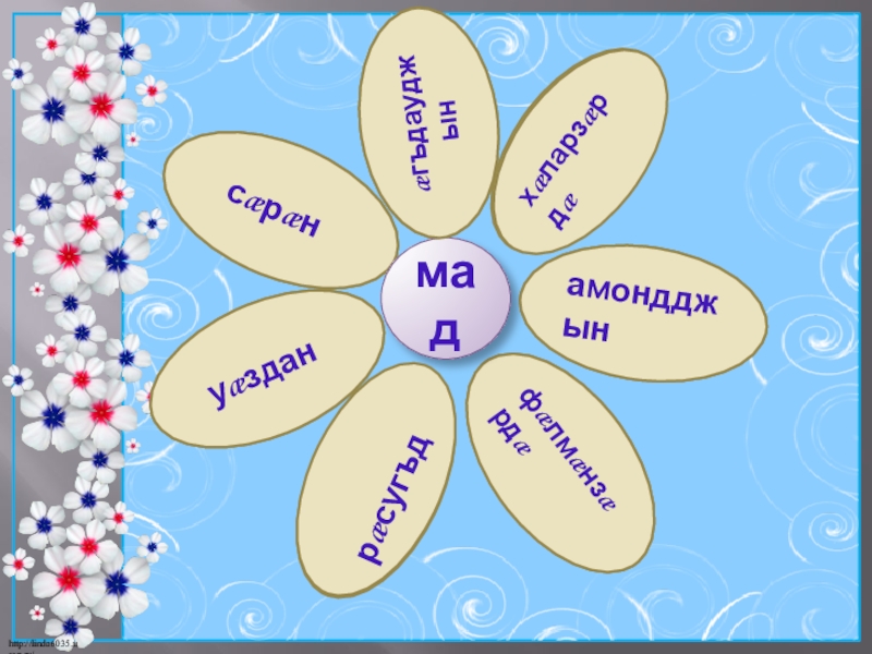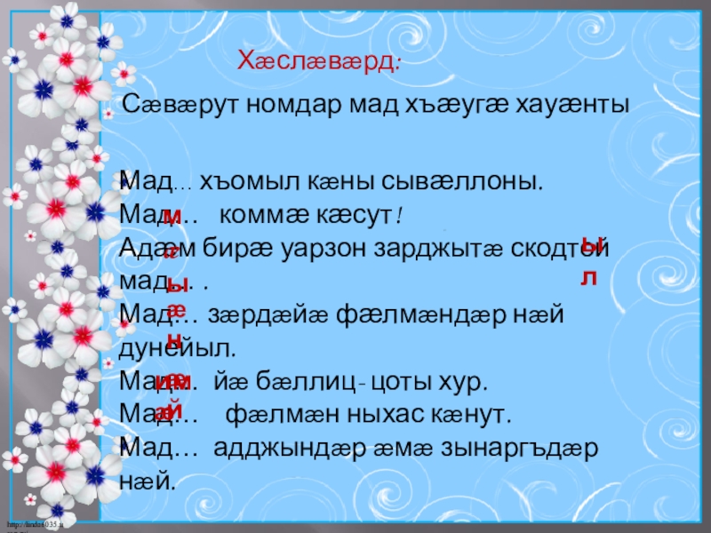 Зæххыл ис бирæ рæсугъд æмæ фæлмæн ныхæстæ. Фæлæ сæ диссагдæр, уарзондæр æмæ зынаргъдæр дзырд у Мад!