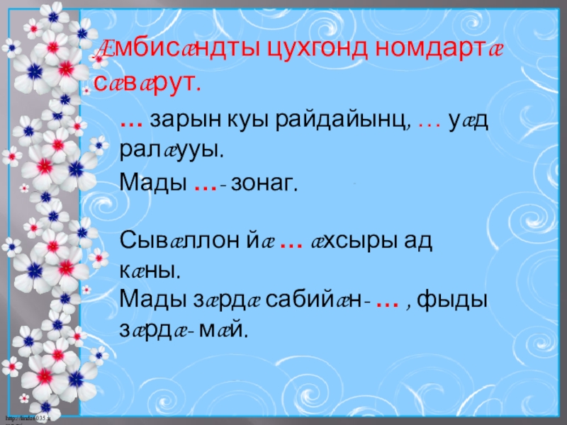 Мады зæрдæ сабийæн- … , фыды зæрдæ- мæй.