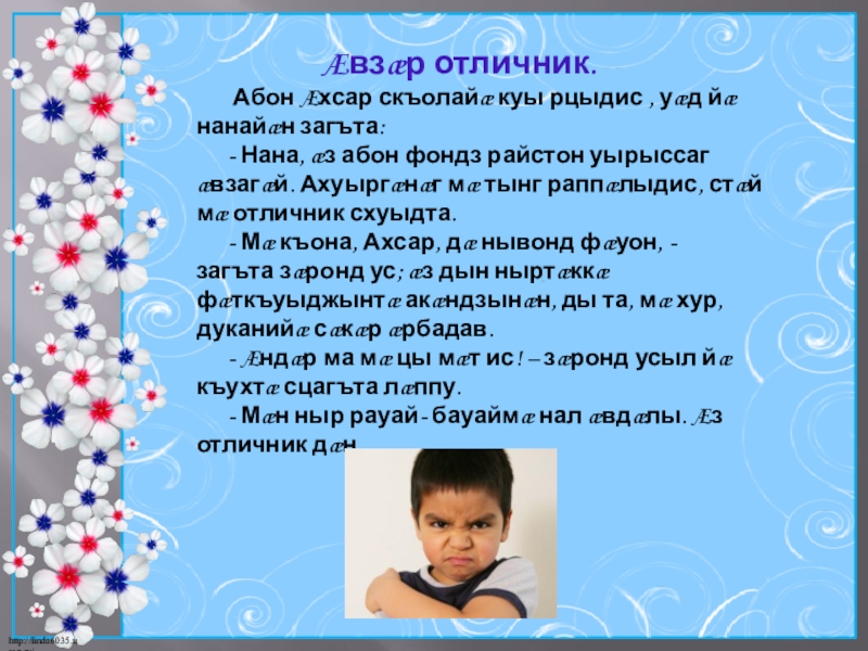 Мад! Уый уарзтæй сыгъдæгдæр нæй, уый æдзухдæр хъахъхъæны йæ сабиты,йæхицæн сæ ницы домы, афтæмæй.