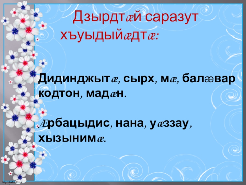 Хъахъхъæнут ныййарæджы! Уымæй зынаргъдæр, уарзондæр ницы ис зæххыл.