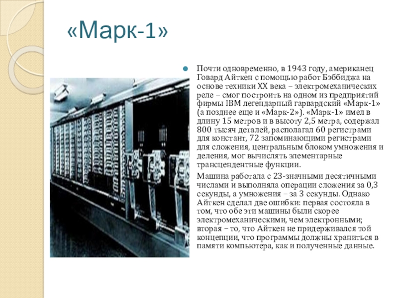 Бэббиджа на основе техники XX века – электромеханических реле – смог построить на одном из предприятий фирмы IBM легендарный гарвардский «Марк-1» (а позднее еще и «Марк-2»). «Марк-1» имел в длину 15 метров и в высоту 2,5 метра, содержал 800 тысяч деталей, располагал 60 регистрами для констант, 72 запоминающими регистрами для сложения, центральным блоком умножения и деления, мог вычислять элементарные трансцендентные функции.