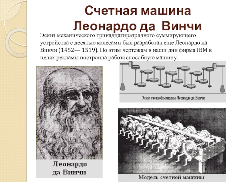 колесами был разработан еще Леонардо да Винчи (1452— 1519). По этим чертежам в наши дни фирма IBM в целях рекламы построила работоспособную машину.