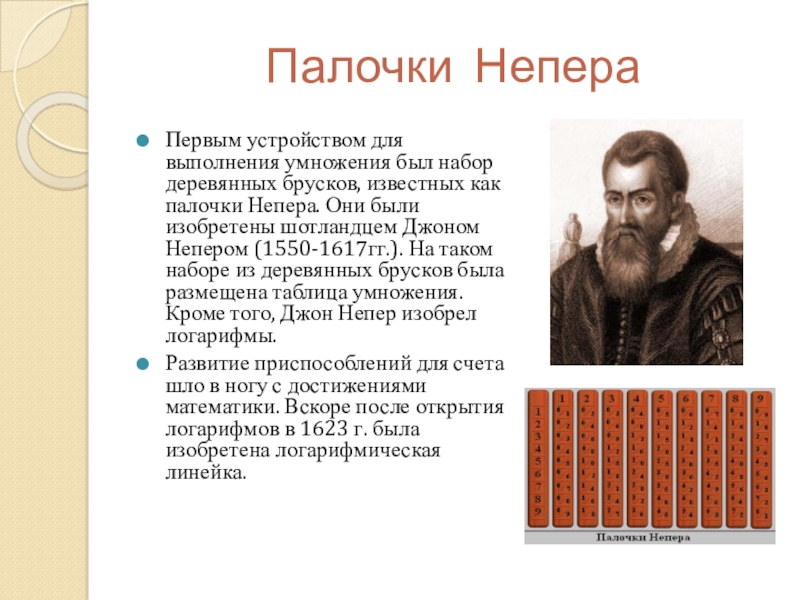 как палочки Непера. Они были изобретены шотландцем Джоном Непером (1550-1617гг.). На таком наборе из деревянных брусков была размещена таблица умножения. Кроме того, Джон Непер изобрел логарифмы.