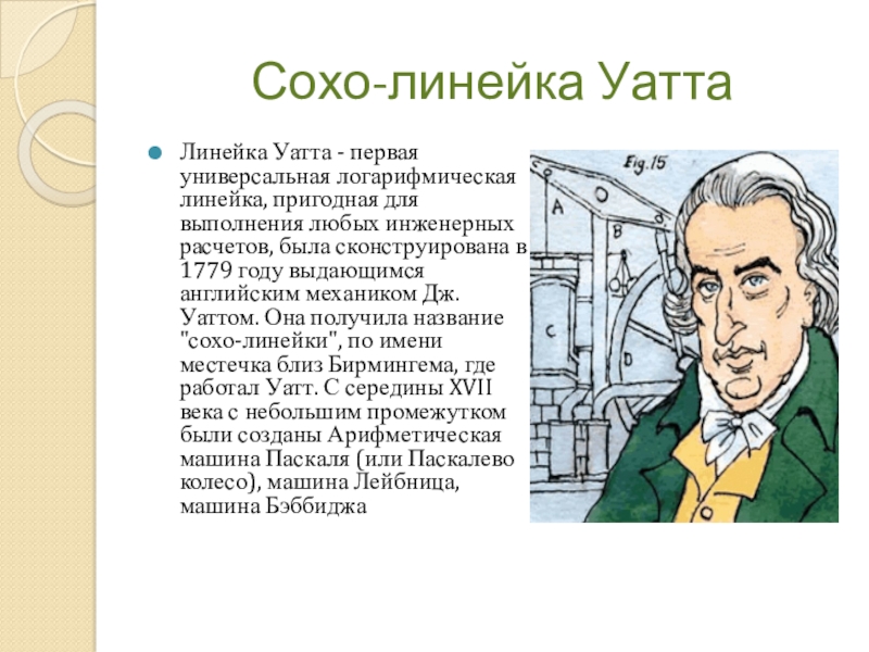 любых инженерных расчетов, была сконструирована в 1779 году выдающимся английским механиком Дж.Уаттом. Она получила название "сохо-линейки", по имени местечка близ Бирмингема, где работал Уатт. С середины XVII века с небольшим промежутком были созданы Арифметическая машина Паскаля (или Паскалево колесо), машина Лейбница, машина Бэббиджа