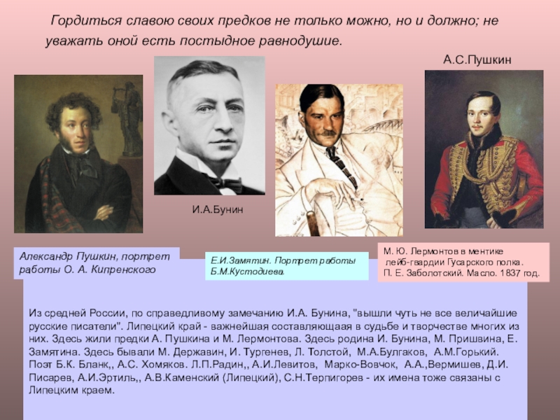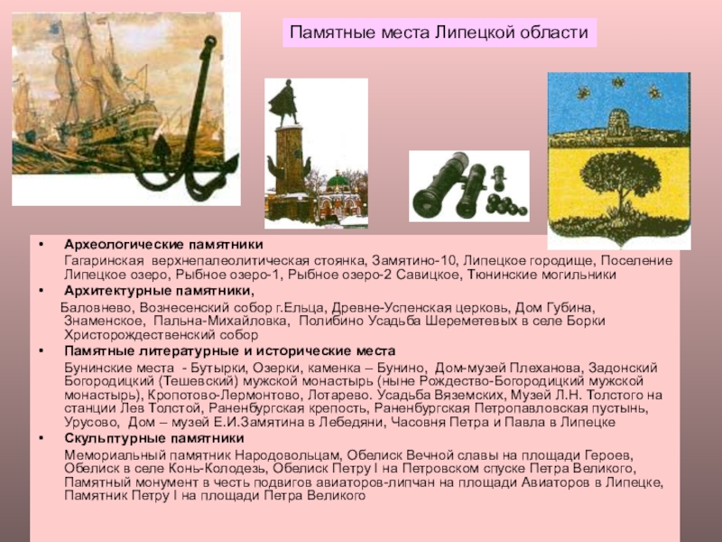 В области сохранилось большое количество усадеб: усадебный дом в селе Полибино (1815 - 1825, архитекторы А.Л. Витберг и Д.И. Жилярди), где бывали И.Е. Репин, К.С. Станиславский, Н.Н. Ге; в усадьбе отца Кроптово неоднократно бывал М. Ю. Лермонтов, Лебедянь посещал И. С. Тургенев. В поселке Лев Толстой (ранее Астапово — место смерти писателя) поставлен мемориальный памятник великому писателю. Липецкая область — родина социал-демократа Г. В. Плеханова (село Гудаловка), путешественника П.П. Семенова-Тян-Шанского, писателей Е. И. Замятина (уроженец Лебедяни), М.М. Пришвина. О жизни известных уроженцев области и истории Липецкого края рассказывают музеи в Липецке, Ельце, Данкове, Усмани, Лебедяни. субъекты