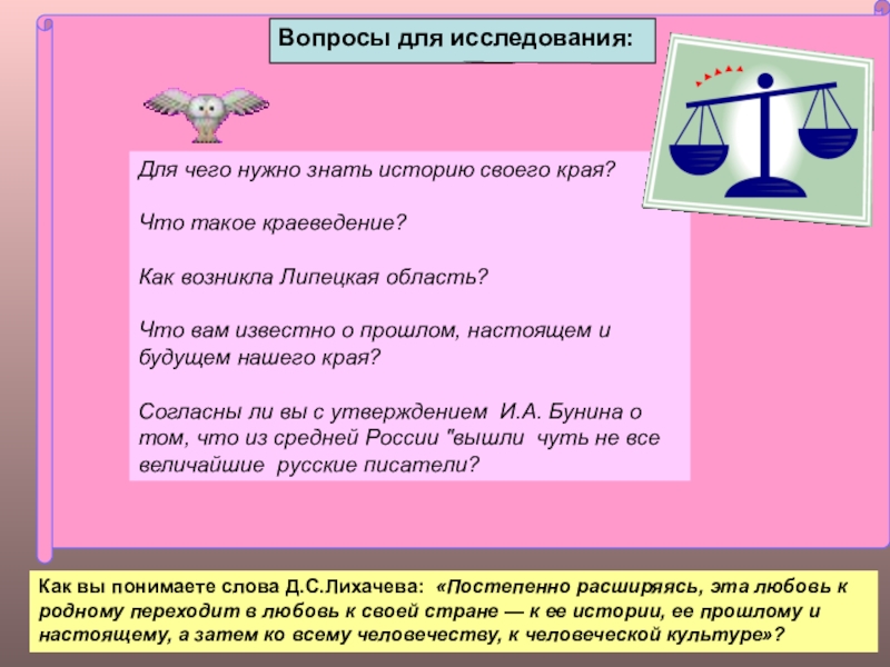 Как вы понимаете слова Д.С.Лихачева: «Постепенно расширяясь, эта любовь к родному переходит в любовь к своей стране — к ее истории, ее прошлому и настоящему, а затем ко всему человечеству, к человеческой культуре»?