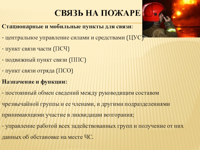 - познакомиться с основными функциями каждого типа пожарной связи;