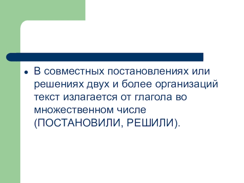 Слайд 18В совместных постановлениях или решениях двух и более организаций текст излагается