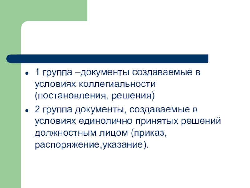 1 группа –документы создаваемые в условиях коллегиальности (постановления, решения)