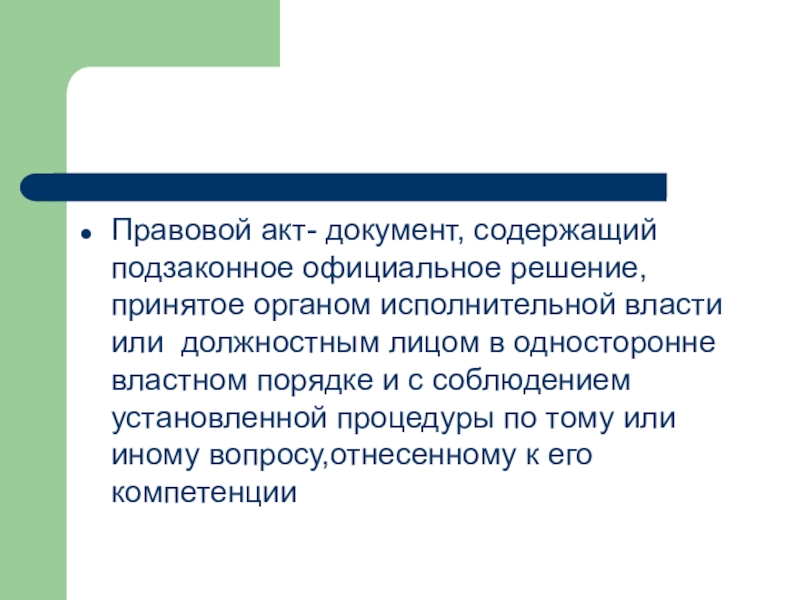 Правовой акт- документ, содержащий подзаконное официальное решение, принятое органом исполнительной власти