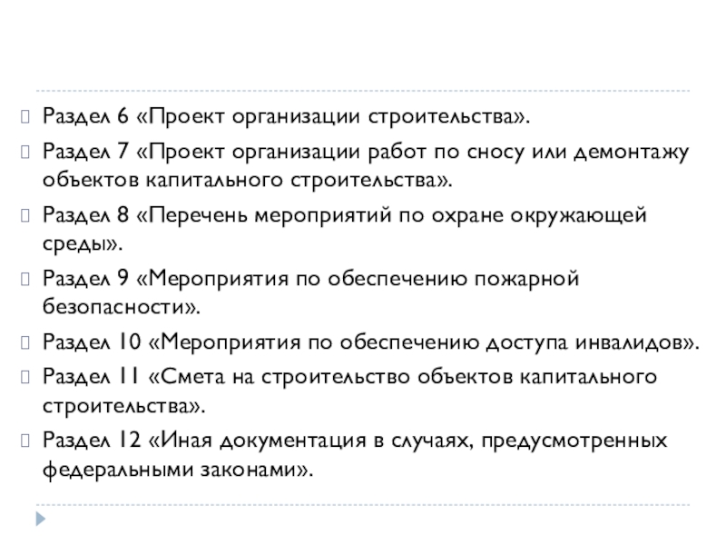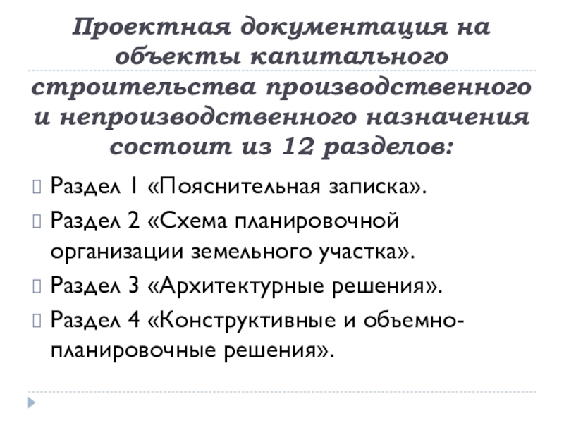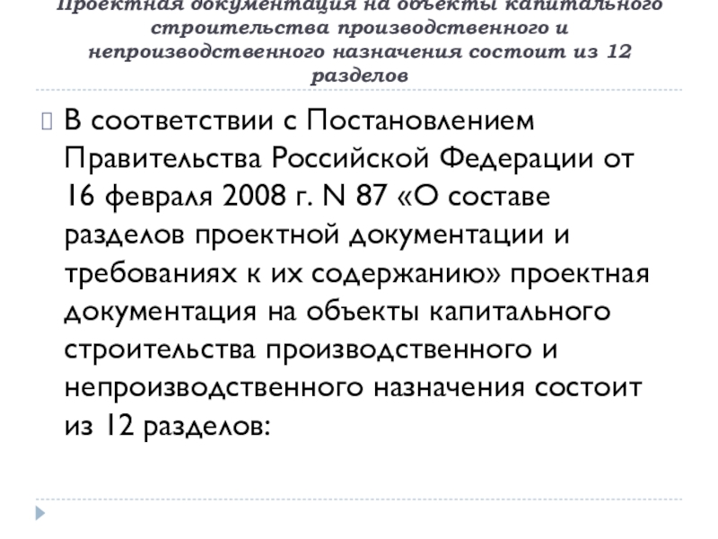 В соответствии с Постановлением Правительства Российской Федерации от 16 февраля 2008 г. N 87 «О составе разделов проектной документации и требованиях к их содержанию» проектная документация на объекты капитального строительства производственного и непроизводственного назначения состоит из 12 разделов: