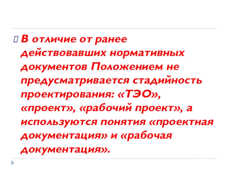 Слайд 10В отличие от ранее действовавших нормативных документов Положением не предусматривается стадийность