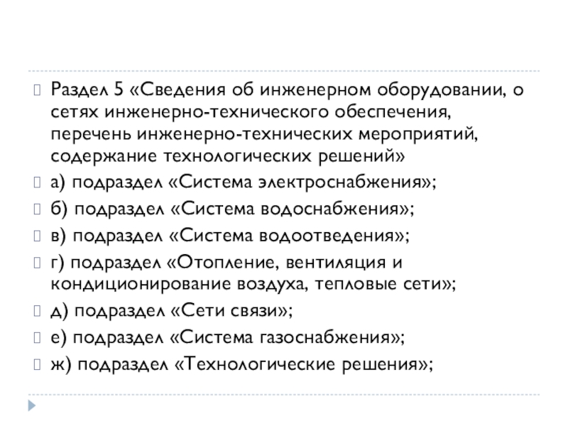 Слайд 16Раздел 5 «Сведения об инженерном оборудовании, о сетях инженерно-технического обеспечения, перечень
