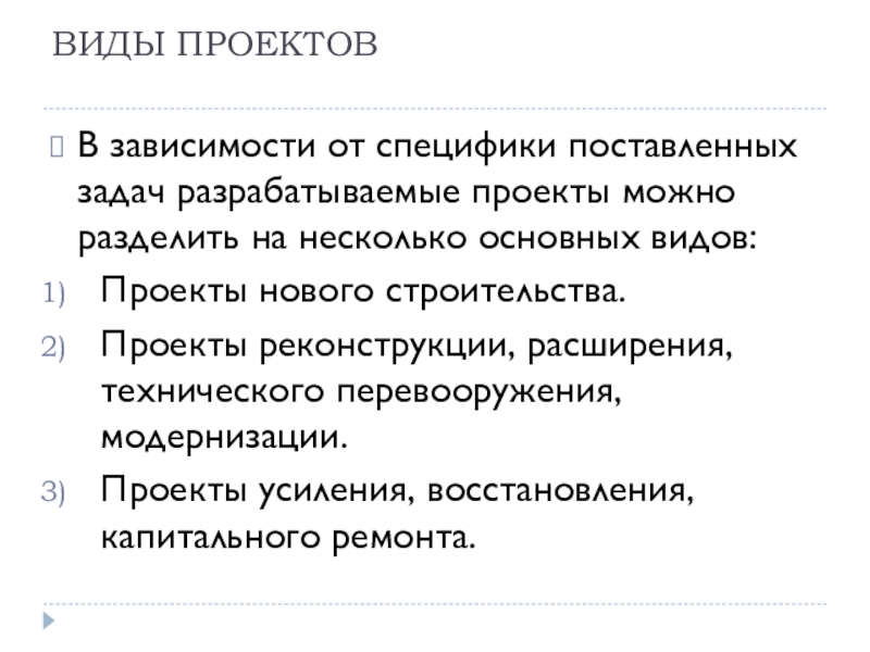 В зависимости от специфики поставленных задач разрабатываемые проекты можно разделить