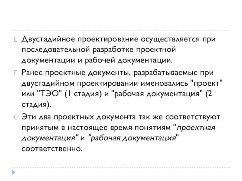Слайд 8Двустадийное проектирование осуществляется при последовательной разработке проектной документации и рабочей документации.