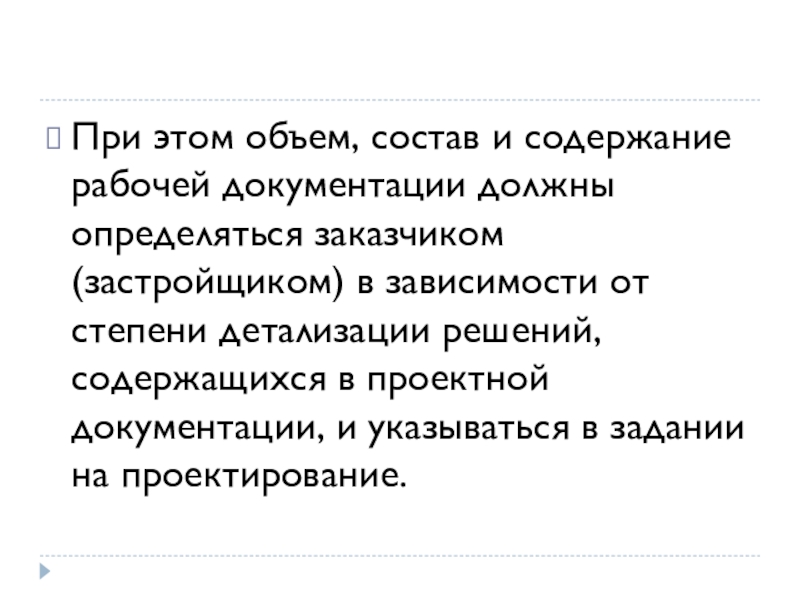 Слайд 12При этом объем, состав и содержание рабочей документации должны определяться заказчиком