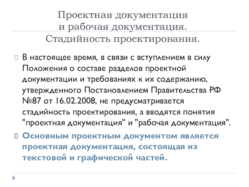 с вступлением в силу Положения о составе разделов проектной документации и требованиях к их содержанию, утвержденного Постановлением Правительства РФ №87 от 16.02.2008, не предусматривается стадийность проектирования, а вводятся понятия "проектная документация" и "рабочая документация".