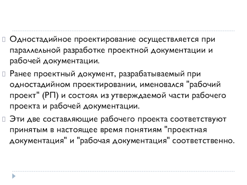 Ранее проектный документ, разрабатываемый при одностадийном проектировании, именовался "рабочий проект" (РП) и состоял из утверждаемой части рабочего проекта и рабочей документации.