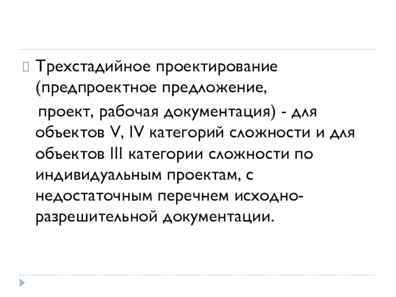 объектов V, IV категорий сложности и для объектов III категории сложности по индивидуальным проектам, с недостаточным перечнем исходно-разрешительной документации.