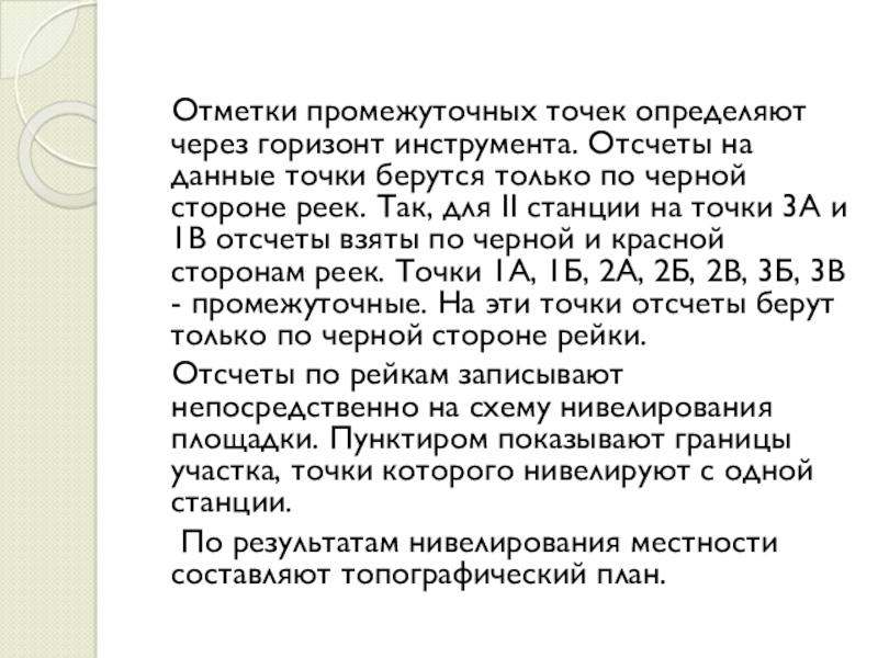 Отсчеты на данные точки берутся только по черной стороне реек. Так, для II станции на точки 3А и 1В отсчеты взяты по черной и красной сторонам реек. Точки 1А, 1Б, 2А, 2Б, 2В, 3Б, 3В - промежуточные. На эти точки отсчеты берут только по черной стороне рейки.