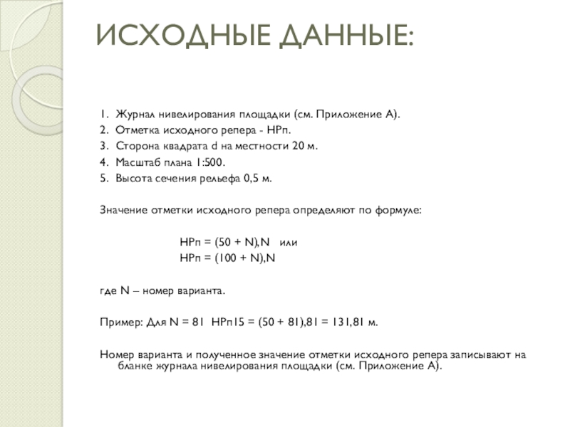 Номер варианта и полученное значение отметки исходного репера записывают на бланке журнала нивелирования площадки (см. Приложение А).