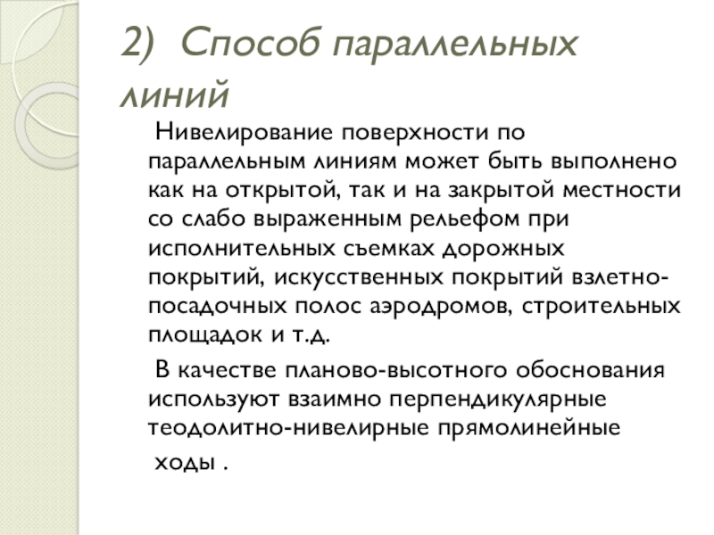 быть использованы следующие способы геометрического нивелирования поверхности: