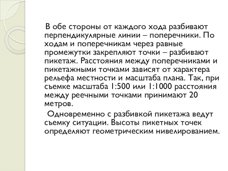 – поперечники. По ходам и поперечникам через равные промежутки закрепляют точки – разбивают пикетаж. Расстояния между поперечниками и пикетажными точками зависят от характера рельефа местности и масштаба плана. Так, при съемке масштаба 1:500 или 1:1000 расстояния между реечными точками принимают 20 метров.