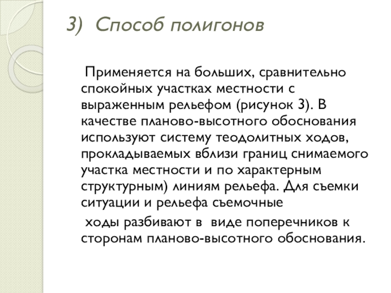 с выраженным рельефом (рисунок 3). В качестве планово-высотного обоснования используют систему теодолитных ходов, прокладываемых вблизи границ снимаемого участка местности и по характерным структурным) линиям рельефа. Для съемки ситуации и рельефа съемочные