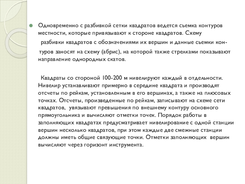 или деревянными столбами, а заполняющие – деревянными кольями. Кроме вершин квадратов закрепляют также перегибы рельефа на сторонах и внутри квадратов.