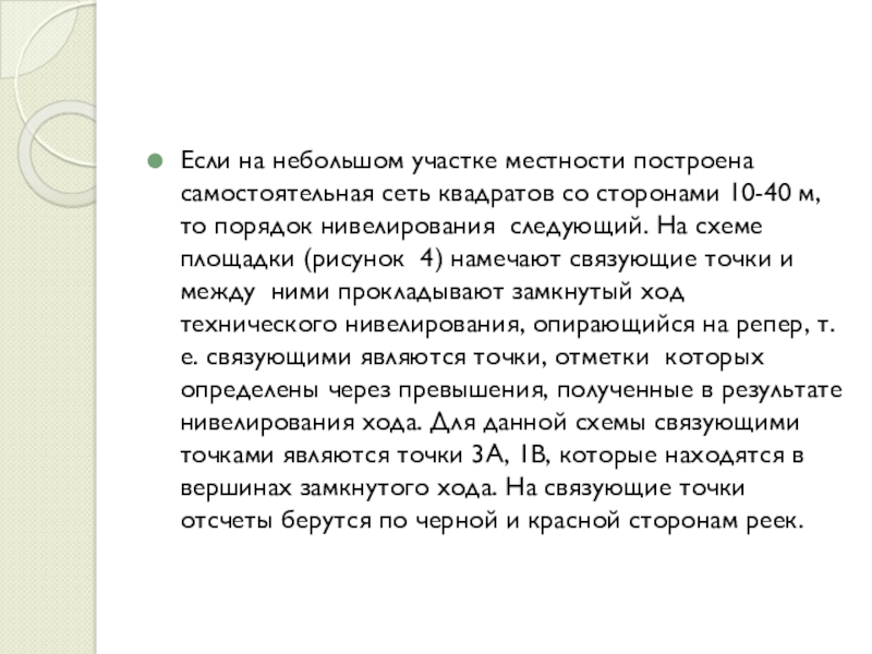 Квадраты со стороной 100-200 м нивелируют каждый в отдельности. Нивелир устанавливают примерно в середине квадрата и производят отсчеты по рейкам, установленным в его вершинах, а также на плюсовых точках. Отсчеты, произведенные по рейкам, записывают на схеме сети квадратов, увязывают превышения по внешнему контуру основного прямоугольника и вычисляют отметки точек. Порядок работы в заполняющих квадратах предусматривает нивелирование с одной станции вершин несколько квадратов, при этом каждые две смежные станции должны иметь общие связующие точки. Отметки заполняющих вершин вычисляют через горизонт инструмента.