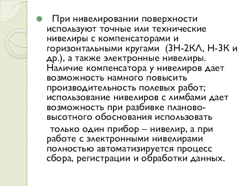 Слайд 14 При нивелировании поверхности используют точные или технические нивелиры с компенсаторами