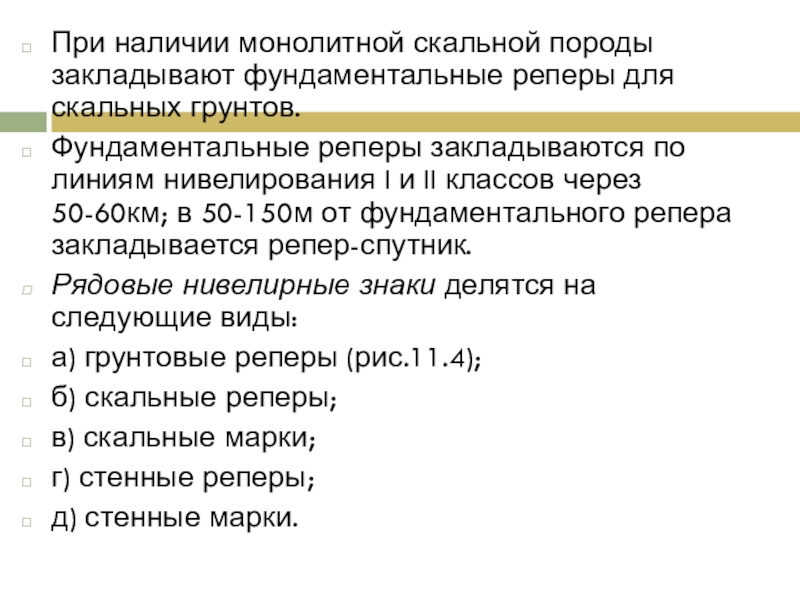 Слайд 24При наличии монолитной скальной породы закладывают фундаментальные реперы для скальных грунтов.