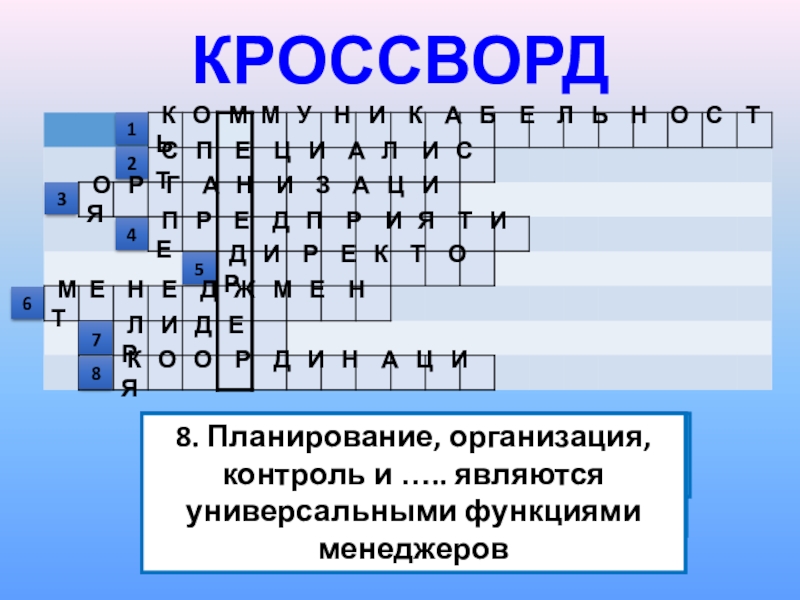 8. Планирование, организация, контроль и ….. являются универсальными функциями менеджеров