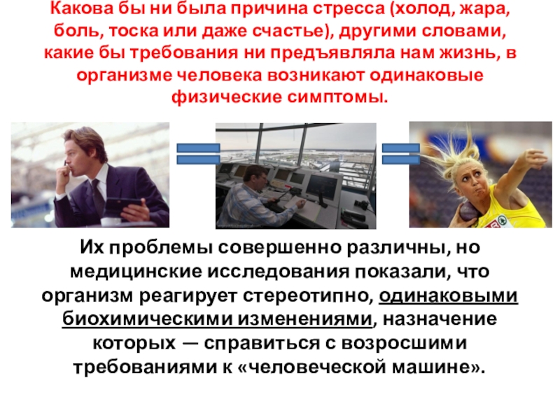 Их проблемы совершенно различны, но медицинские исследования показали, что организм реагирует стереотипно, одинаковыми биохимическими изменениями, назначение которых — справиться с возросшими требованиями к «человеческой машине».