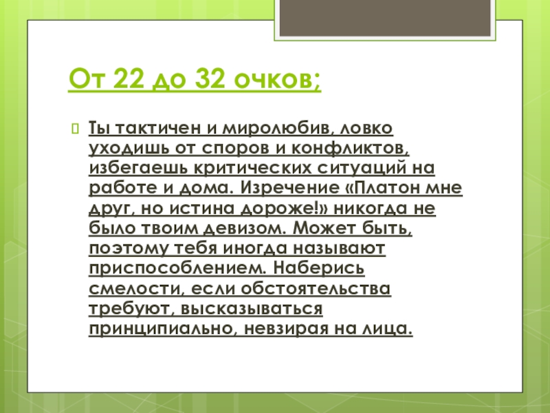 споров и конфликтов, избегаешь критических ситуаций на работе и дома. Изречение «Платон мне друг, но истина дороже!» никогда не было твоим девизом. Может быть, поэтому тебя иногда называют приспособлением. Наберись смелости, если обстоятельства требуют, высказываться принципиально, невзирая на лица.