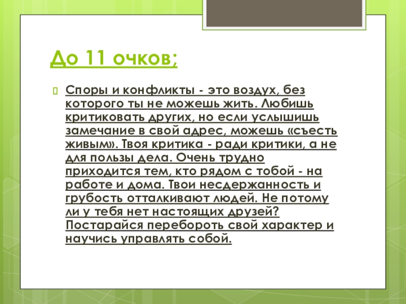 деле конфликтуешь лишь тогда, когда нет иного выхода и другие средства исчерпаны. Ты твердо отстаиваешь свое мнение, не думая о том , как это отразится на твоем служебном положении или приятельских отношениях. При этом ты не выходишь за рамки корректности, не унижаешься до оскорблений. Это вызывает уважение к тебе.